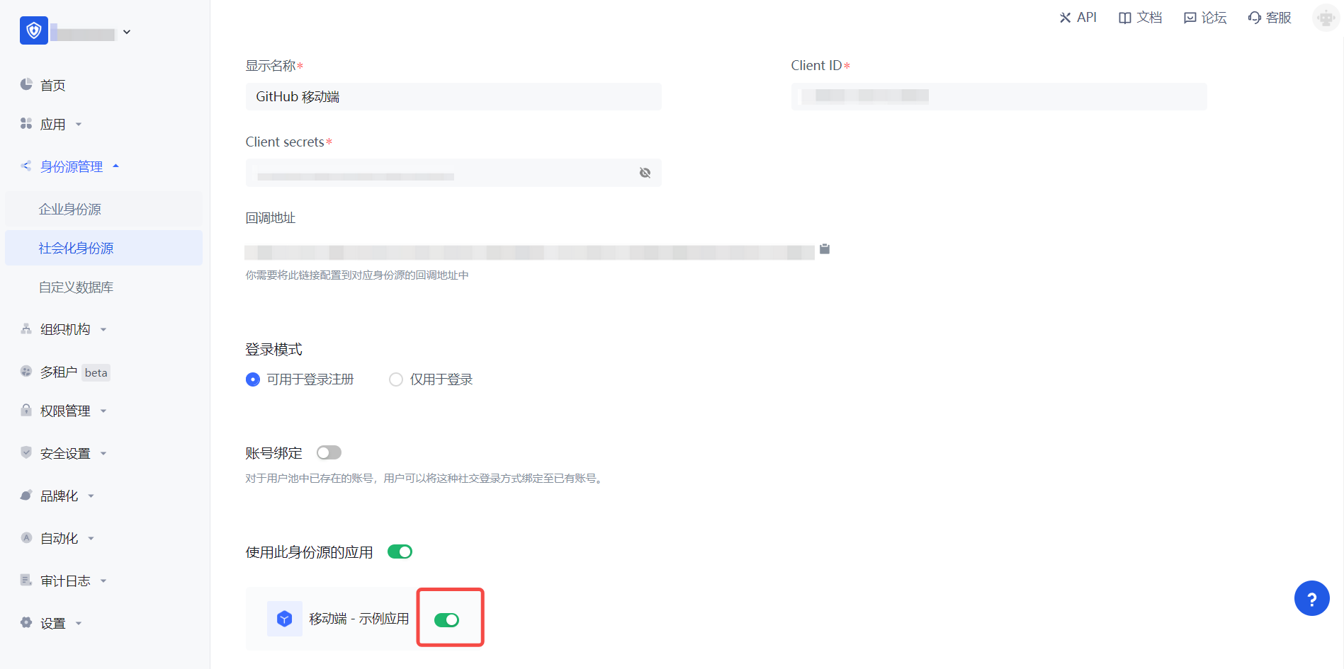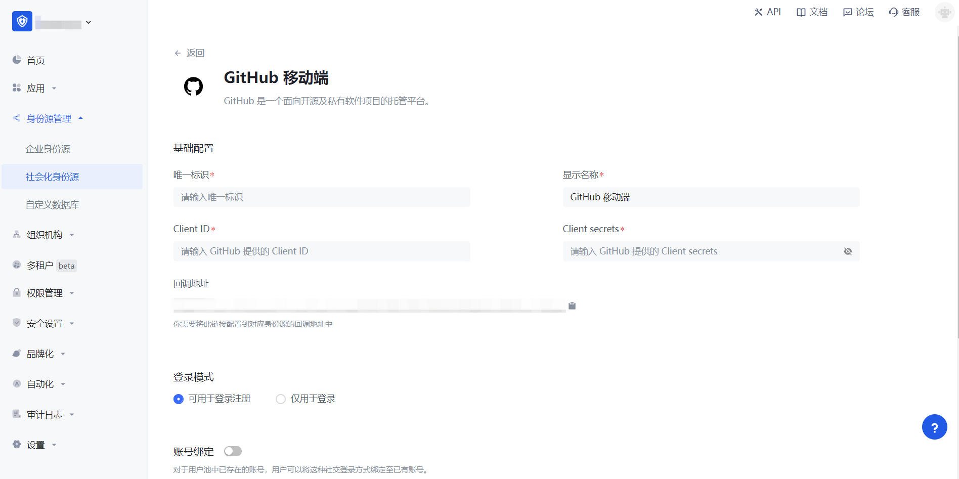 2.3 请在 GenAuth 控制台 的「社会化身份源」-「Github 移动端」页面,配置相关的字段信息。