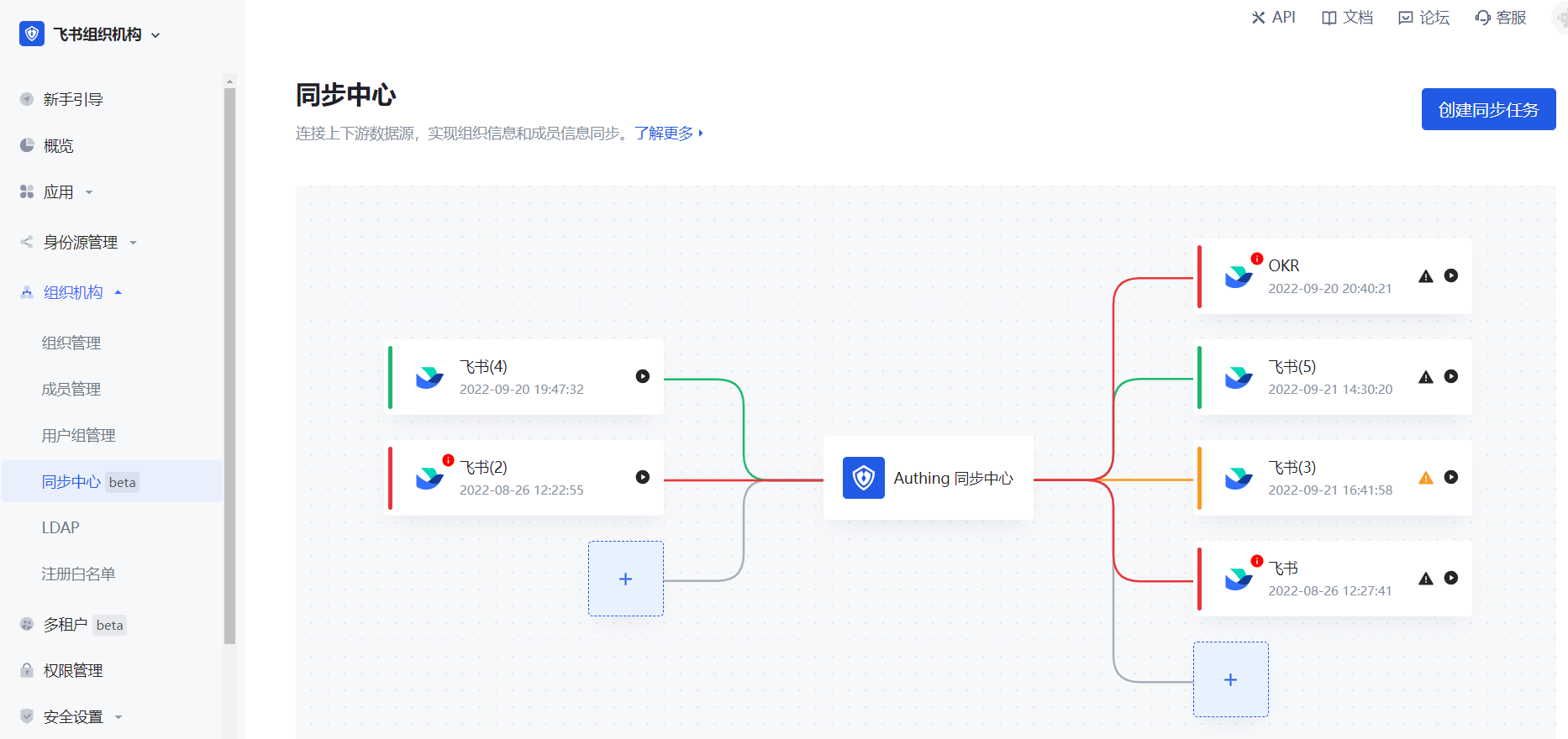 在 控制台 点击左侧导航栏 用户管理->同步中心(对于 ToE 的场景,路径是 组织机构->同步中心)即可进入同步中心管理页面 ,在这里你可以看到所有已创建的同步任务,也可以创建新的同步任务。