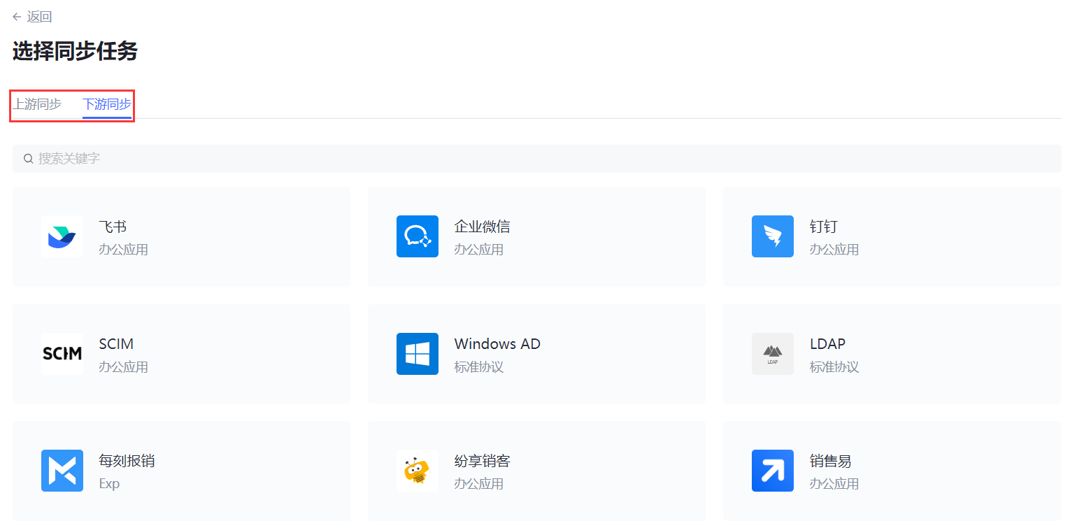 - 在 选择同步任务 窗口根据需要切换 上游同步 / 下游同步 选项卡,选择进入一个上 / 下游应用。打开该应用的同步任务创建窗口。
