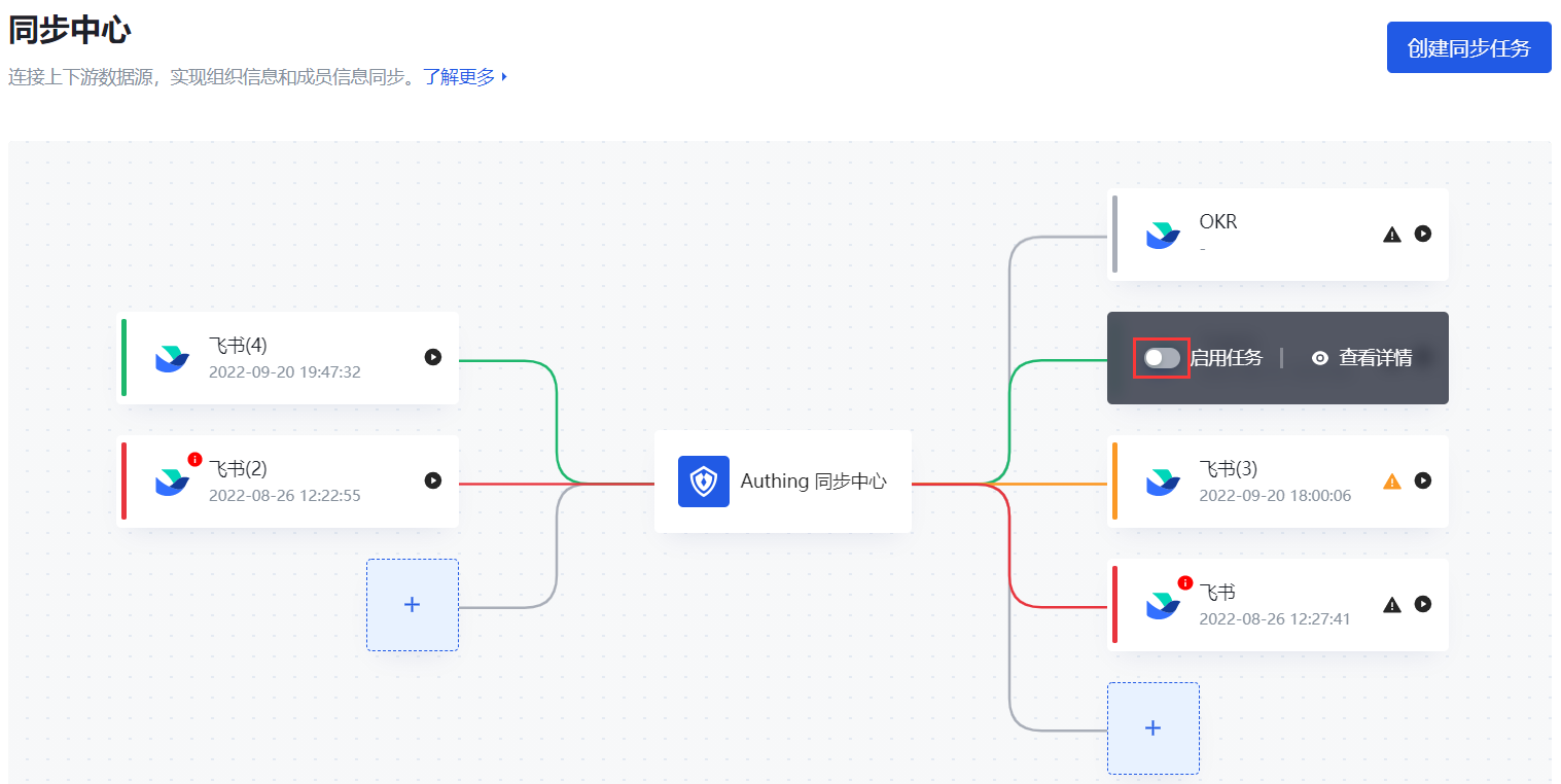 同步中心画布展示所有已创建的同步任务。对于已创建的同步任务,管理员还可以 查看各同步任务的执行状态,查看和修改同步任务信息,启用 / 禁用同步任务,删除同步任务等。